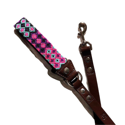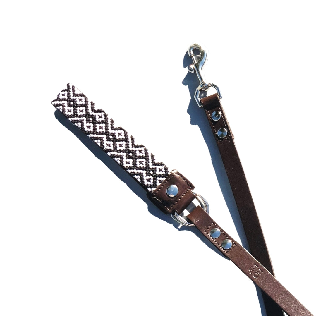 In the Highlands of Chiapas, Mexico, the leash's vibrant textile is hand woven by artisans using the Maya technique "Trenzado a Mano". The leash is finished with water-resistant latigo leather and a thick steel clasp.