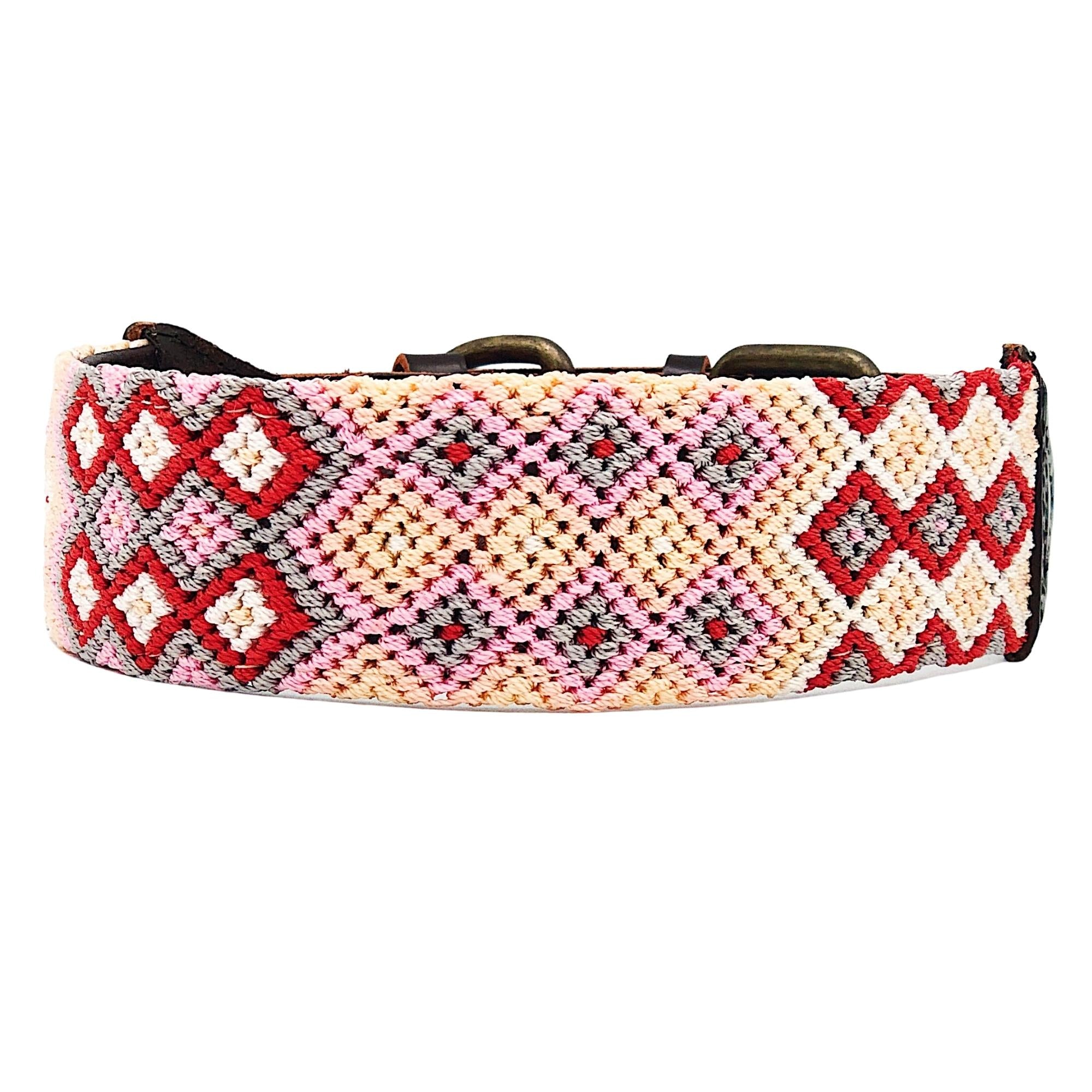 • In the Highlands of Chiapas, Mexico, the collar's vibrant textile is hand woven by female artisans using the Maya technique "Trenzado a Mano". The D-ring and buckle are ultra-strong, brass-finished steel. The collar features a padded leather interior for the comfort of your dog and a special ring for the ID tag.