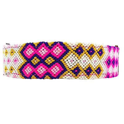 In the Highlands of Chiapas, Mexico, the collar's vibrant textile is hand woven by female artisans using the Maya technique "Trenzado a Mano". The D-ring and buckle are ultra-strong, brass-finished steel. The collar features a padded leather interior for the comfort of your dog and a special ring for the ID tag.