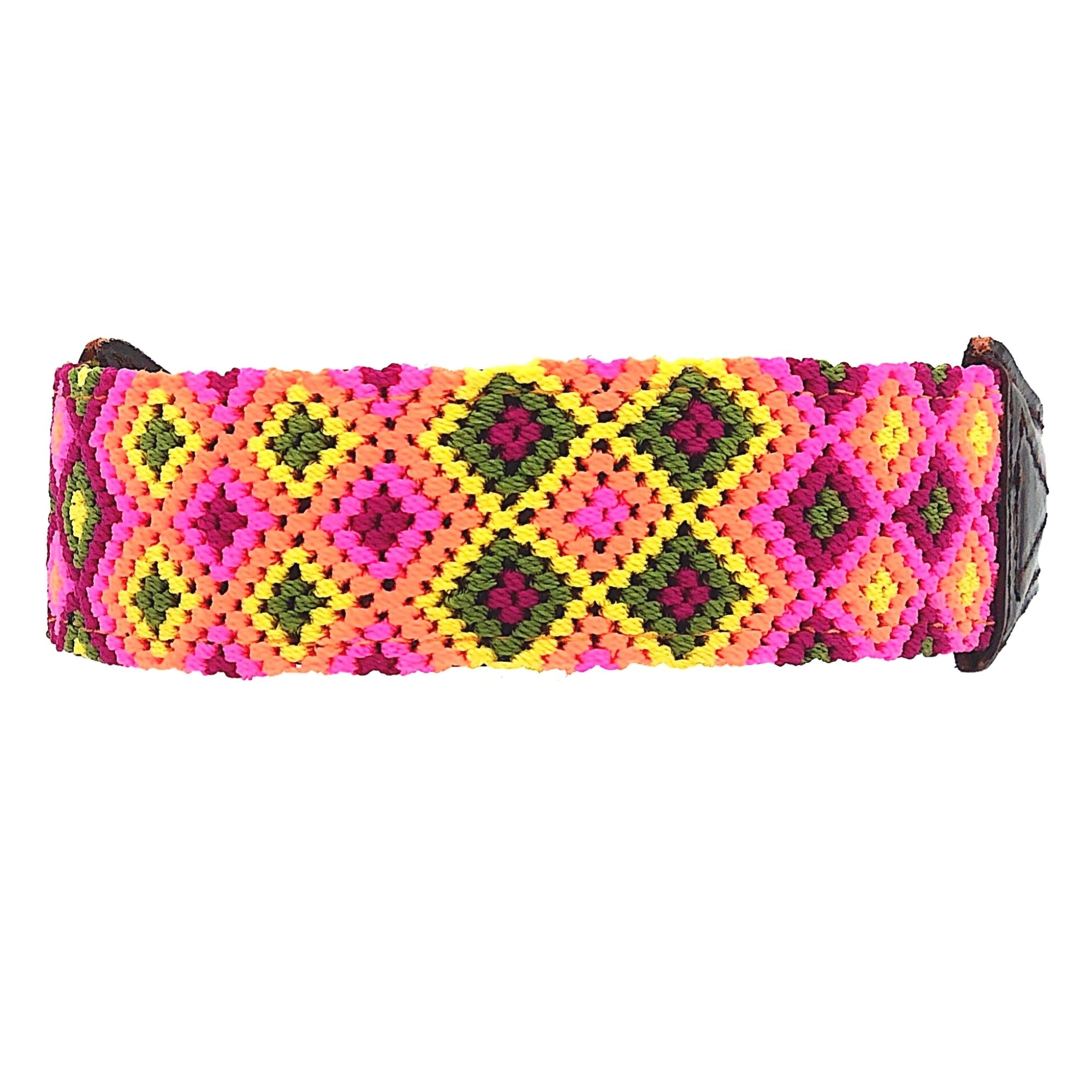 • In the Highlands of Chiapas, Mexico, the collar's vibrant textile is hand woven by female artisans using the Maya technique "Trenzado a Mano". The D-ring and buckle are ultra-strong, brass-finished steel. The collar features a padded leather interior for the comfort of your dog and a special ring for the ID tag.