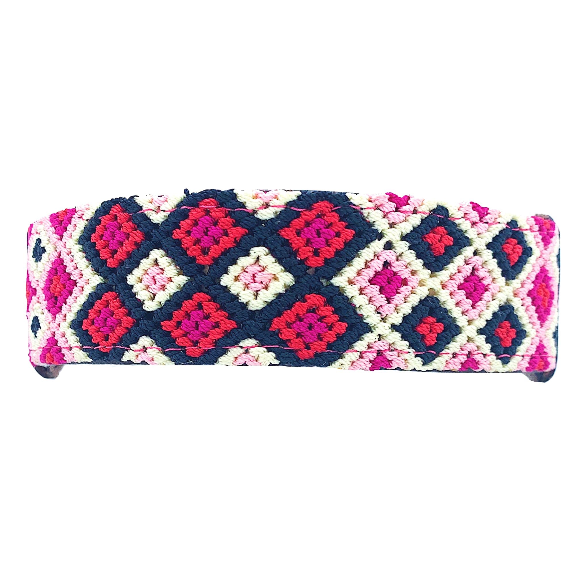 • In the Highlands of Chiapas, Mexico, the collar's vibrant textile is hand woven by female artisans using the Maya technique "Trenzado a Mano". The D-ring and buckle are ultra-strong, brass-finished steel. The collar features a padded leather interior for the comfort of your dog and a special ring for the ID tag.