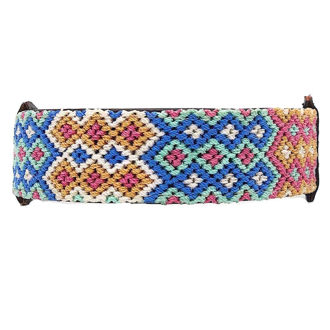 In the Highlands of Chiapas, Mexico, the collar's vibrant textile is hand woven by female artisans using the Maya technique "Trenzado a Mano". The D-ring and buckle are ultra-strong, brass-finished steel. The collar features a padded leather interior for the comfort of your dog and a special ring for the ID tag.