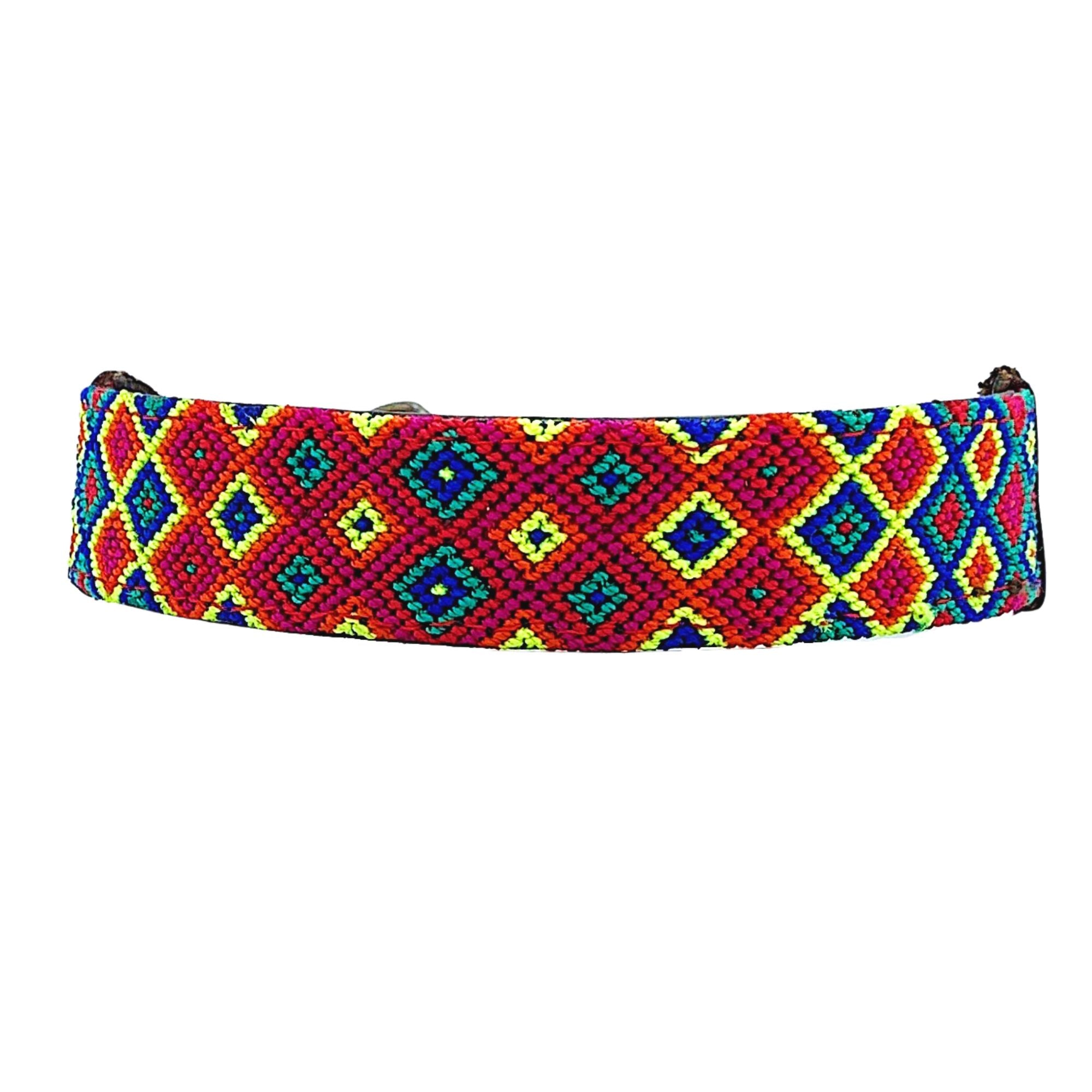 • In the Highlands of Chiapas, Mexico, the collar's vibrant textile is handwoven by female artisans using the Maya technique "Trenzado a Mano". The D-ring and buckle are ultra-strong, brass-finished steel. The collar features a padded leather interior for the comfort of your dog and a special ring for the ID tag.