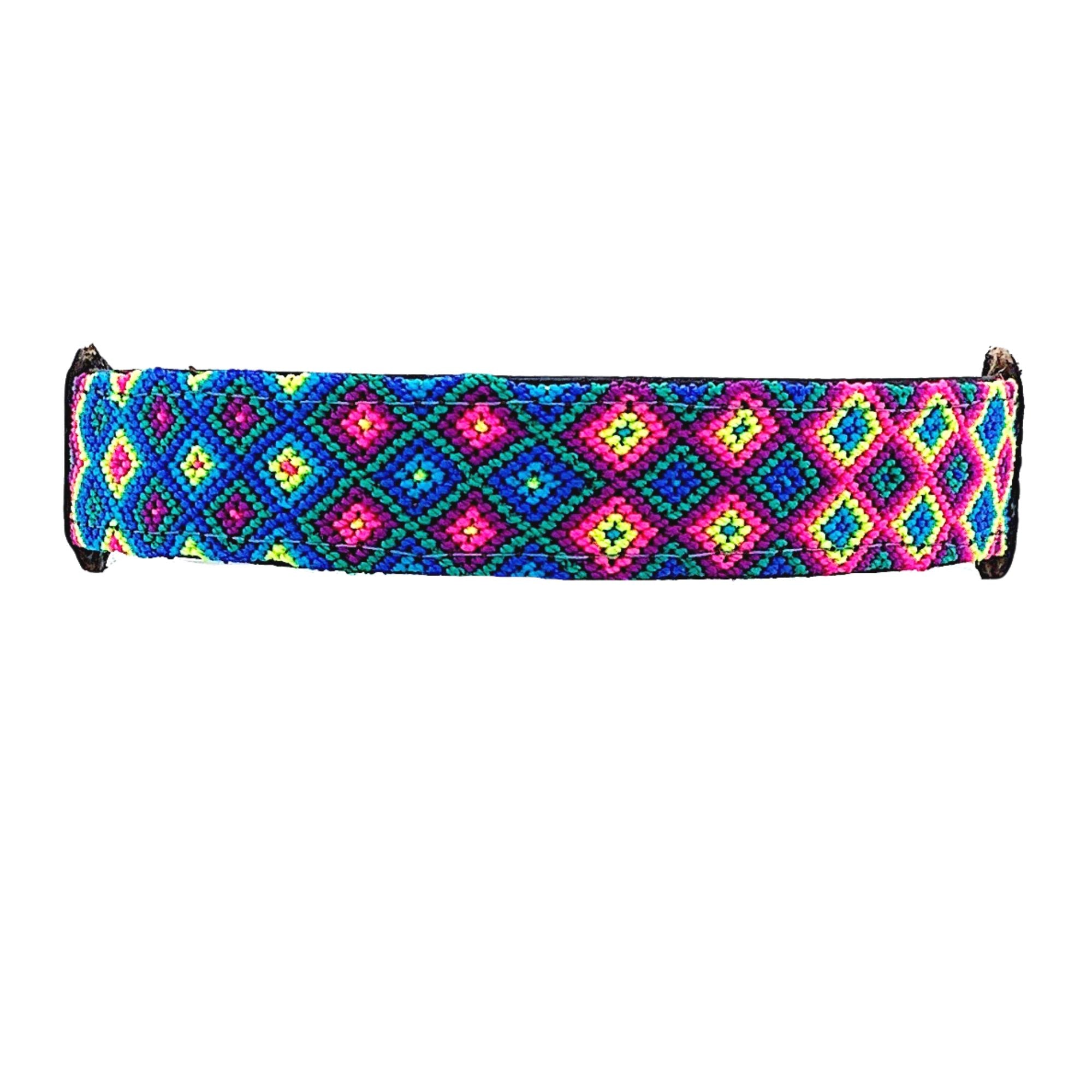 In the Highlands of Chiapas, Mexico, the collar's vibrant textile is handwoven by female artisans using the Maya technique "Trenzado a Mano". The D-ring and buckle are ultra-strong, brass-finished steel. The collar features a padded leather interior for the comfort of your dog and a special ring for the ID tag.