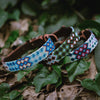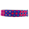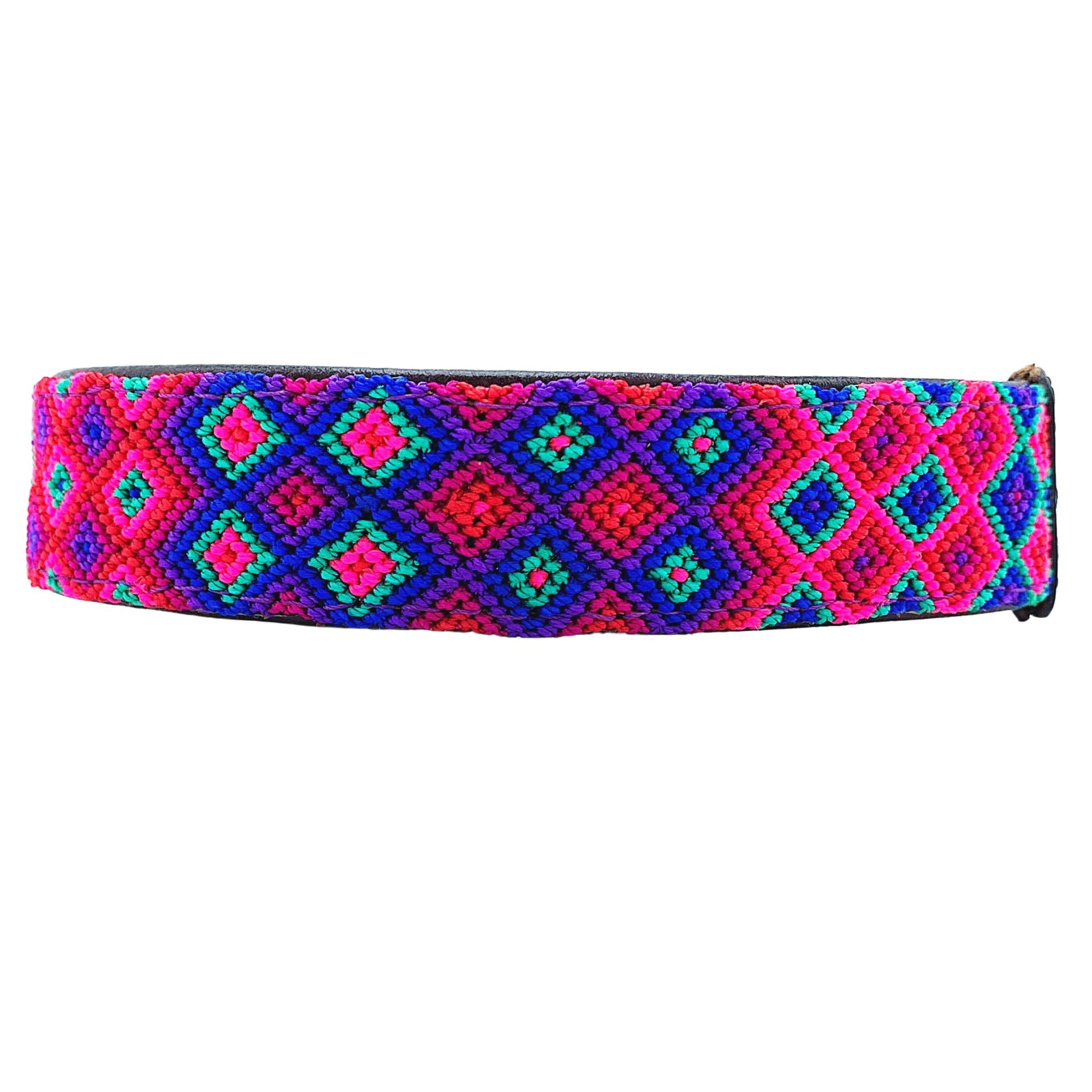 In the Highlands of Chiapas, Mexico, the collar's vibrant textile is handwoven by female artisans using the Maya technique "Trenzado a Mano". The D-ring and buckle are ultra-strong, brass-finished steel. The collar features a padded leather interior for the comfort of your dog and a special ring for the ID tag.