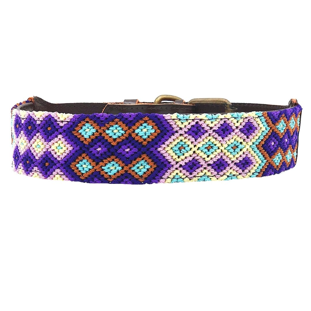 • In the Highlands of Chiapas, Mexico, the collar's vibrant textile is hand woven by female artisans using the Maya technique "Trenzado a Mano". The D-ring and buckle are ultra-strong, brass-finished steel. The collar features a padded leather interior for the comfort of your dog and a special ring for the ID tag.