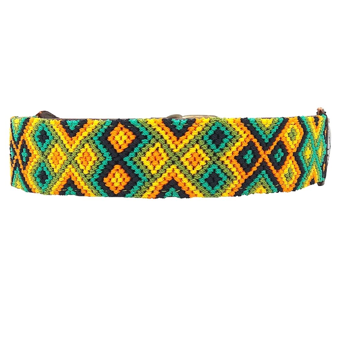 • In the Highlands of Chiapas, Mexico, the collar's vibrant textile is hand woven by female artisans using the Maya technique "Trenzado a Mano". The D-ring and buckle are ultra-strong, brass-finished steel. The collar features a padded leather interior for the comfort of your dog and a special ring for the ID tag.