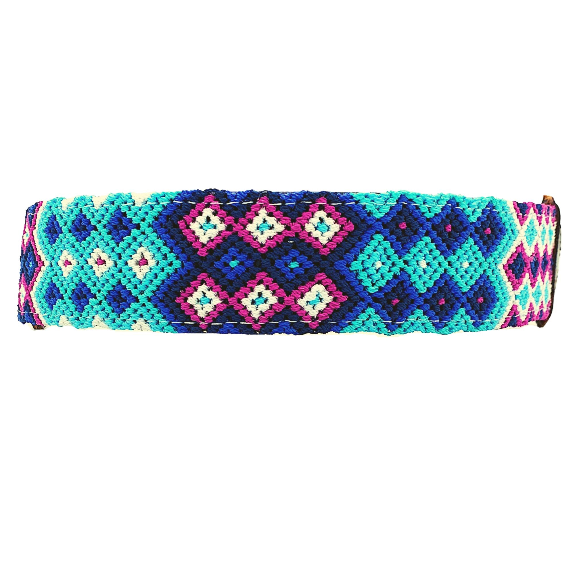 • In the Highlands of Chiapas, Mexico, the collar's vibrant textile is hand woven by female artisans using the Maya technique "Trenzado a Mano". The D-ring and buckle are ultra-strong, brass-finished steel. The collar features a padded leather interior for the comfort of your dog and a special ring for the ID tag.
