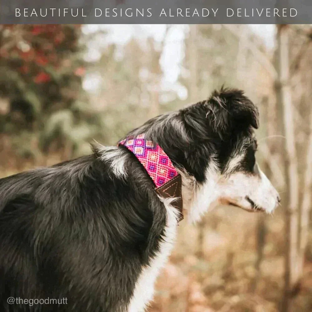 • In the Highlands of Chiapas, Mexico, the collar's vibrant textile is hand woven by female artisans using the Maya technique "Trenzado a Mano". The D-ring and buckle are ultra-strong, brass-finished steel. The collar features a padded leather interior for the comfort of your dog and a special ring for the ID tag.