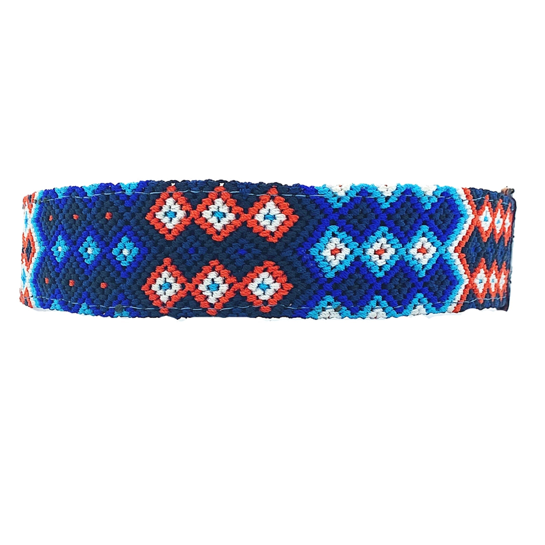 • In the Highlands of Chiapas, Mexico, the collar's vibrant textile is hand woven by female artisans using the Maya technique "Trenzado a Mano". The D-ring and buckle are ultra-strong, brass-finished steel. The collar features a padded leather interior for the comfort of your dog and a special ring for the ID tag.