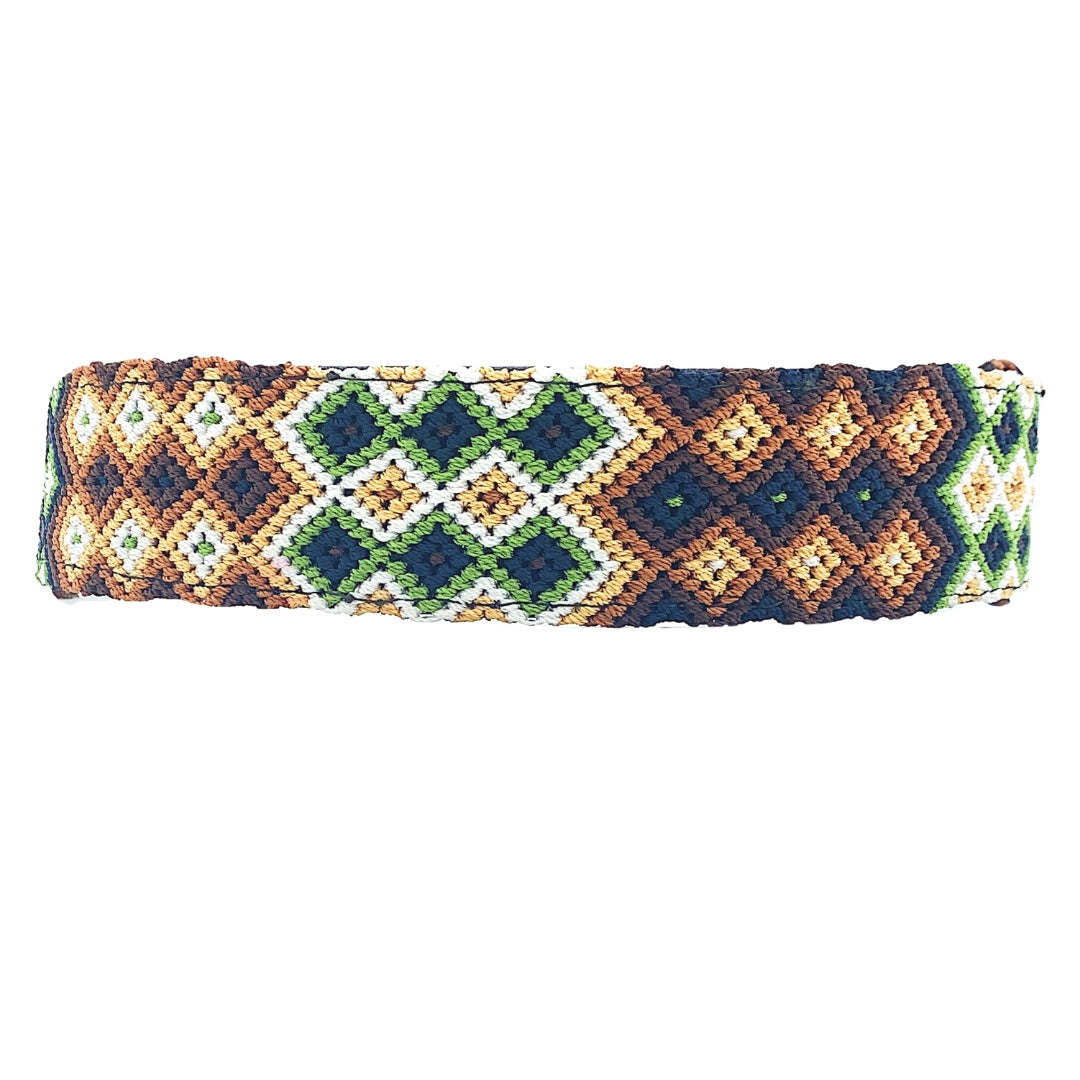 • In the Highlands of Chiapas, Mexico, the collar's vibrant textile is hand woven by female artisans using the Maya technique "Trenzado a Mano". The D-ring and buckle are ultra-strong, brass-finished steel. The collar features a padded leather interior for the comfort of your dog and a special ring for the ID tag.